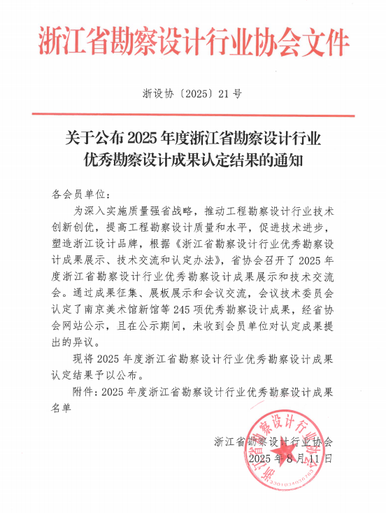 發(fā)布日期:2025.08.26 近日,2025年度浙江省勘察設(shè)計(jì)行業(yè)優(yōu)秀勘察設(shè)計(jì)成果評選結(jié)果正式公布。由我院牽頭設(shè)計(jì)的“奉化江堤防整治工程鄞奉交界段”項(xiàng)目,繼榮獲寧波市優(yōu)秀勘察設(shè)計(jì)獎之... -