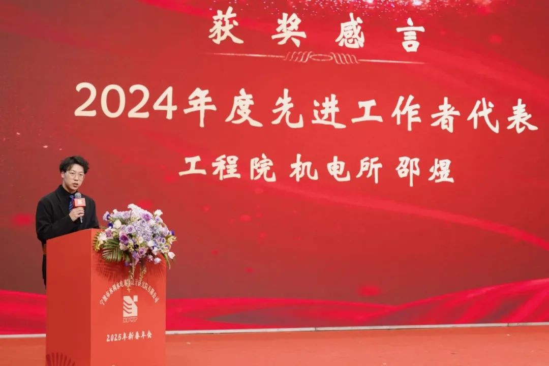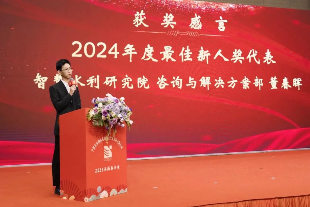 2024年度先進工作者獲獎代表工程院機電所的邵煜、2024年度最佳奉獻獎獲獎者綜合部的陳曉鳴、2024年度最佳新人獎獲獎代表智慧水利研究院咨詢與解決方案部的董春暉,先后上臺發(fā)表獲獎感言。