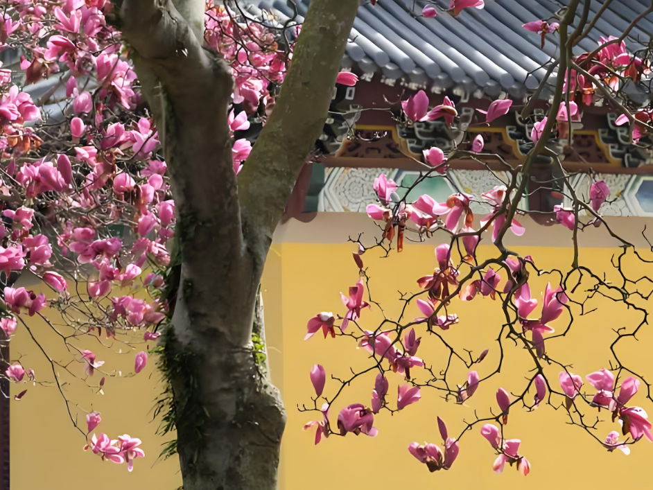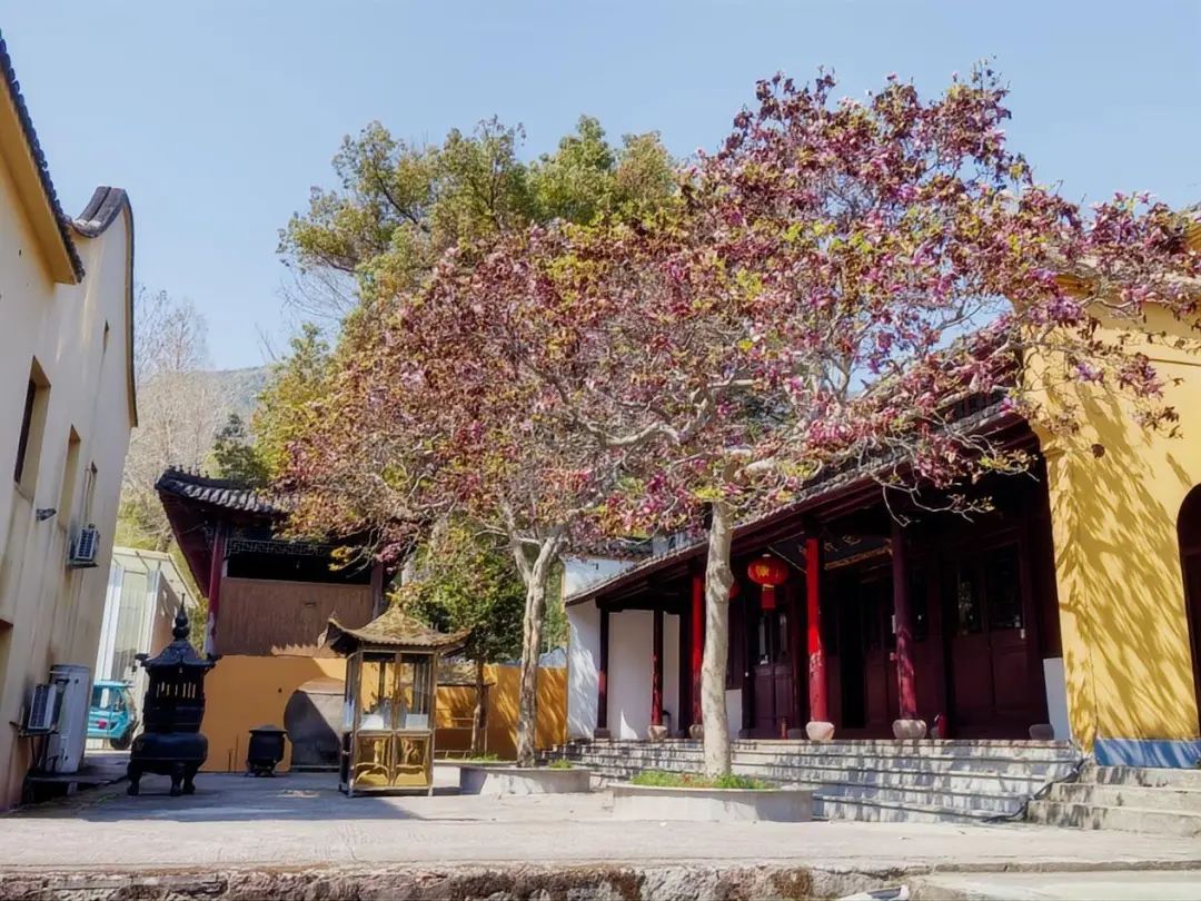 早上8:45,大巴準(zhǔn)時從園區(qū)啟程,在陽光明媚中駛向?qū)幉ㄏ笊綁︻^鎮(zhèn)舫前村。抵達(dá)智門禪寺時,茶園環(huán)繞,竹海綿延,百年紫玉蘭正值花期。大家或駐足欣賞古剎花影,或在禪寺咖啡館品鑒特色飲品,于傳統(tǒng)與現(xiàn)代交融中開啟這一天的芳菲之旅。