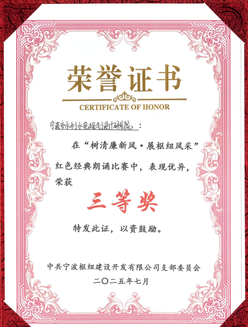 為慶祝中國共產(chǎn)黨成立104周年,2025年7月1日,寧波樞紐建設(shè)開發(fā)有限公司隆重舉行了“紅動(dòng)樞紐·同心共建”迎“七一”主題黨建活動(dòng)。作為寧波樞紐片區(qū)重要參建單位和黨建聯(lián)盟成員,我院黨總支書記、副院長(zhǎng)王洪霞帶隊(duì)參與了本次活動(dòng),并且,我院兩位青年職工攜選送作品在“樹清廉新風(fēng)·展樞紐風(fēng)采”樞紐片區(qū)紅色經(jīng)典朗誦比賽中榮獲三等獎(jiǎng)。
