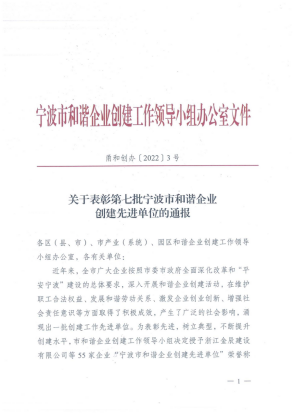 我院榮獲寧波市第七批“和諧企業(yè)創(chuàng)建先進(jìn)單位”榮譽(yù)稱號(hào)