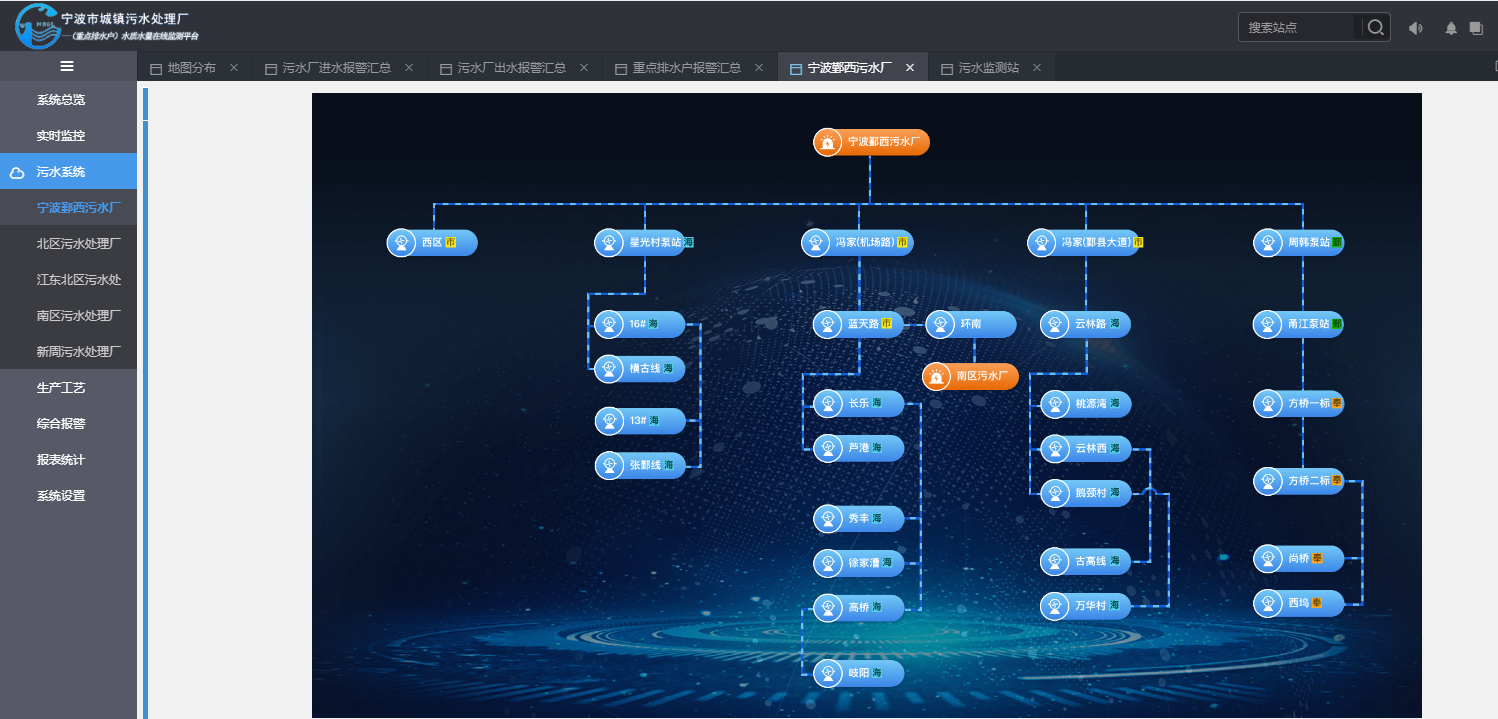 對(duì)轄區(qū)范圍內(nèi)的城鎮(zhèn)污水處理廠(chǎng)進(jìn)行管理,結(jié)合污水管理需求,開(kāi)發(fā)污水廠(chǎng)站點(diǎn)管理、污水廠(chǎng)進(jìn)出水報(bào)警、各級(jí)污水廠(chǎng)實(shí)時(shí)數(shù)據(jù)監(jiān)控、污水系統(tǒng)統(tǒng)計(jì)、生產(chǎn)工藝展示、污水廠(chǎng)巡檢等功能,實(shí)現(xiàn)城鎮(zhèn)污水系統(tǒng)的高效在線(xiàn)化管理。