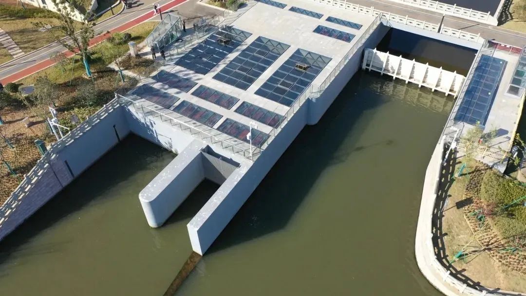 與常見的泵站不同,洋市中心河泵站以公園式城市排水泵站為設(shè)計理念,采用無廠房結(jié)構(gòu),將泵站主體結(jié)構(gòu)置于地下,降低對沿江視線的遮擋,地面則與城市景觀有機融合,既能排水又可供市民休閑觀景。