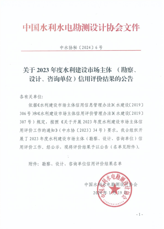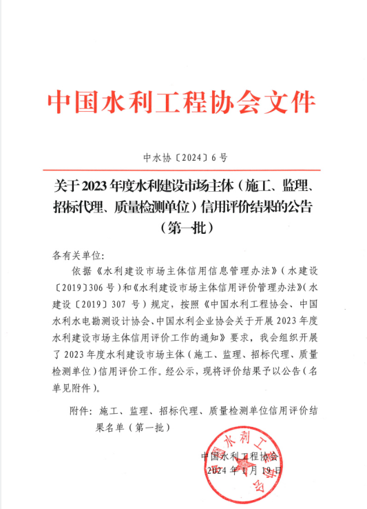 近日,中國(guó)水利工程協(xié)會(huì)《關(guān)于2023年度水利建設(shè)市場(chǎng)主體(施工、監(jiān)理、招標(biāo)代理、質(zhì)量檢測(cè)單位)信用評(píng)價(jià)結(jié)果的公告(第一批)》(中水協(xié)〔2024〕6號(hào))、中國(guó)水利水電勘測(cè)設(shè)計(jì)協(xié)會(huì)《關(guān)于2023年度水利建設(shè)市場(chǎng)主體(勘察、設(shè)計(jì)、咨詢單位)信用評(píng)價(jià)結(jié)果的公告》(中水協(xié)秘〔2024〕6號(hào))、《關(guān)于2023年度全國(guó)水利水電勘測(cè)設(shè)計(jì)行業(yè)信用評(píng)價(jià)結(jié)果的公告》(中水協(xié)秘〔2024〕7號(hào))發(fā)布。